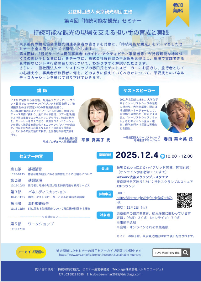 12月4日(木)に東京観光財団主催の第4回「持続可能な観光」セミナー:持続可能な観光の現場を支える担い手の育成と実践」にゲストスピーカーとして、当法人の地域連携マネージャーの春田が登壇させていただきます。オンラインでも参加可能ですので、ぜひお申し込みいただけますと幸いです!