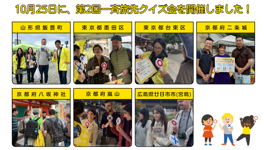 10月25日(土)に第2回一斉旅先クイズ会を開催しました!今年は、山形県・東京都2エリア・京都府3エリア・広島県の4都府県連携、7地域で実施いたしました。