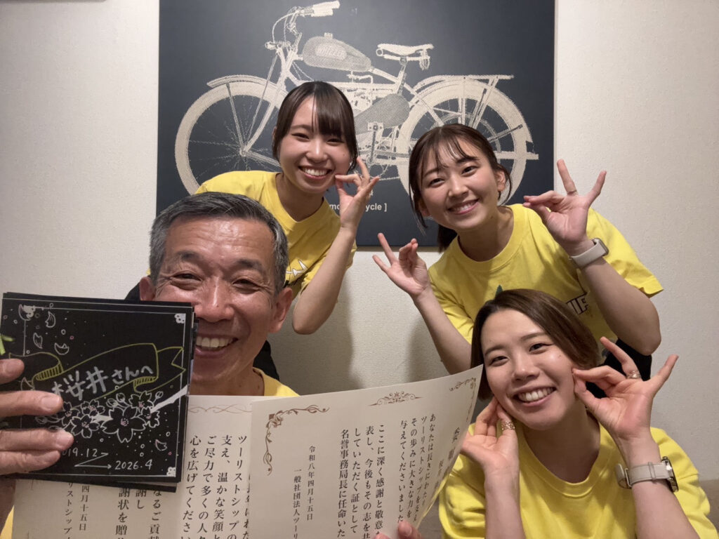 昔の高倉健さん主演の映画『幸せの黄色いハンカチ』になぞらえて、「ツーリストシップで皆さんに幸せを届けたい」──そんな気持ちで活動していました。ツーリストシップを通して、本当に多くのご縁をいただきました。年上のご年配の方から学生の皆さままで、幅広い世代の方々に支えていただいたことに、心より感謝しております。