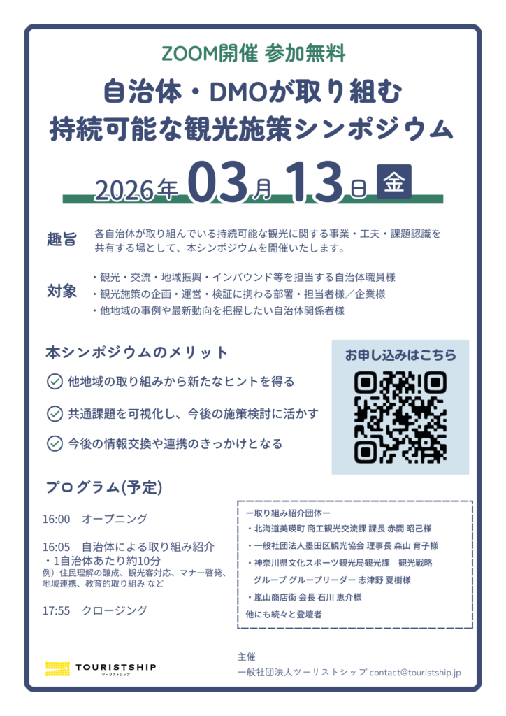 一般社団法人ツーリストシップは、2026年3月13日(金)に「自治体・DMOが取り組む持続可能な観光施策シンポジウム」をオンラインにて開催いたします。本シンポジウムは、全国の自治体が現場で取り組んでいる持続可能な観光施策を共有し、自治体やDMO同士が学び合い、つながる場として初めて開催するものです。